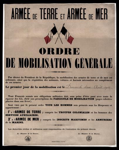 | Keywords: Ordre de Mobilisation générale 2 août 1914.jpg fr Affiche de l'Ordre de Mobilisation Générale des Armée de Terre et de Mer françaises du 1er août 1914 placardé partout en France en Poster of the mobilization in France on august 1 1914 This poster was put on the walls everywhere in France 1914-08-01 for publication 2014-07-06 for upload ARK-BNF French Government Jebulon for search upload stitch correction and restoration http //gallica bnf fr/ark /12148/btv1b9017865v/f1 item thumb left Assessments 1 crop correction of tears scratches dust dirt due to age desaturation contrast reworked sharpness added With Lightroom5 and GIMP PD-old-70 Uploaded with UploadWizard World War I posters of France World War I mobilization August 1914 in France World War I in August 1914 Flags of France Armies in World War I Files from Gallica Black background Valued images by Jebulon Featured pictures of France Featured pictures by Jebulon Ordre de Mobilisation Générale original poster august 2 1914 06 29 15 July 2014 UTC Ordre de Mobilisation générale 2 août 1914 jpg |
