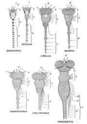 | Keywords: Origin of Vertebrates Fig 025.png Fig 25 ”Comparison of Invertebrate Brains from Branchipus to AmmocĹ“tes All references in this work to AmmocĹ“tes or Petromyzon appear to refer to the species now called Lampetra planeri 1908 The Origin of Vertebrates https //archive org/details/originofvertebra1908gask Walter Holbrook Gaskell PD-old-auto-1923 1914 Origin of Vertebrates book Branchipus Astacus Limulus polyphemus anatomy Scorpio Androctonus Thelyphonus Lampetra planeri Invertebrate brain Animal brain comparisons |