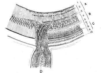 Keywords: Origin of Vertebrates Fig 041.png Fig 41 ”Retina and Optic Nerve of Petromyzon After Müller and Langerhans On the left side the Müllerian fibres and pigment-epithelium are represented alone The retina is divided into an epithelial part C the layer of visual rod-cells and a neurodermal or cerebral part which is formed of A the ganglion of the optic nerve and B the ganglion of the retina 1 int limiting membrane; 2 int molecular layer with its two layers of cells; 3 layer of optic nerve fibres; 4 int nuclear layer; 5 double row of tangential fulcrum cells; 6 layer of terminal retinal fibres; 7 ext nuclear layer; 8 ext limiting membrane; 9 layer of rods; 10 layer of pigment-epithelium D axial cell layer Axenstrang in optic nerve The layer 6 is drawn rather too thick All references in this work to AmmocÅ“tes or Petromyzon appear to refer to the species now called Lampetra planeri 1908 The Origin of Vertebrates https //archive org/details/originofvertebra1908gask Walter Holbrook Gaskell PD-old-auto-1923 1914 Origin of Vertebrates book Lampetra planeri Retina Nervus opticus