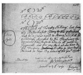 | Keywords: Original Draft of Indented Notes of 1690.jpg Original Draft of Indented Notes of 1690 From Wikisource The Founding of New England by w James Truslow Adams http //www dinsdoc com/adams-1-i11 htm Original in Massachusetts Archives State House Boston 1690 signed by several people PD-old-100 James Truslow Adams Massachusetts Archives 1690 |