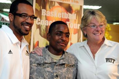 | Keywords: Orlando Early Agnus Berenato.jpg en U S Army Staff Sgt Bryan Smith center from Philadelphia Pa poses for a photograph with National Collegiate Athletic Association basketball coaches at Camp As Sayliyah Qatar Aug 11 Orlando Early University of Louisiana-Monroe men's basketball head coach and Agnus Berenato University of Pittsburg women's basketball head coach traveled overseas to offer U S troops gratitude and encouragement along with three other NCAA basketball coaches Next the five coaches will travel to several locations in Afghanistan where they will attempt to make two stops per day according to a representative with Koeberle and Associates the sports marketing agency coordinating the trip 2009-08-11 12 13 09 http //www dvidshub net/image/194076/basketball-coaches-travel-overseas-say-thanks URCfHGdHo1A Dustin Senger Orlando Early 2009 jpg PD-USGov Uploaded with UploadWizard Agnus Berenato Orlando Early ImageNote 1 221 23 656 897 3000 1993 2 w Orlando Early ImageNoteEnd 1 ImageNote 2 2055 259 701 852 3000 1993 2 w Agnus Berenato ImageNoteEnd 2 |