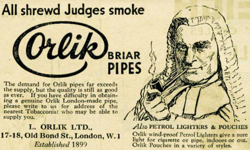 | Keywords: Orlik pipes advertisement.jpg Advertisement for the Orlik pipe company showing their trademark judge figure http //pipesmagazine com/forums/topic/a-few-cool-vintage-ads Pipemagazine com 1920 Orlik Company Advertisements in the United Kingdom Smokers pipes in art Judges in art 1920 advertisements Unclear-PD-US-old-70 |