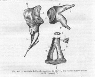 | Keywords: OrMoyenneChauveau1890MeyCh.jpg en The small bones of the middle ear of the horse Equus caballus fr Les osselets de l'oreille moyenne du cheval Equus caballus E enclume Et étrier L lenticulaire M marteau <br /> ” Chauveau Auguste Arloing Saturnin Traité d'anatomie comparée des animaux domestiques <br /> 1 064 p page 950 1890 Paris Lib J B Baillière et Fils domaine public décès des auteurs 1917 et 1911 Meyer Ch 2011-03-23 PD-old Horse bones Horse ears Mammal ear anatomy Ossicles | ||||