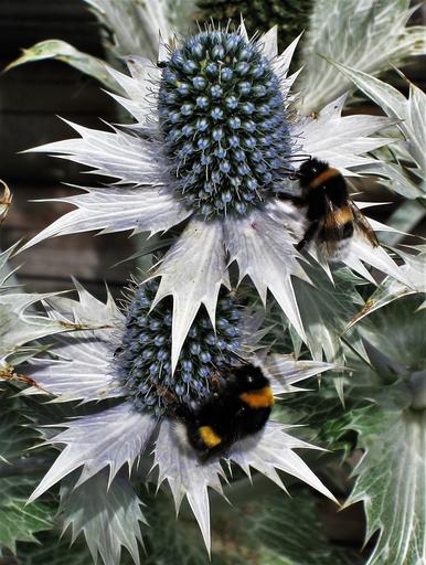 Keywords: ornamental thistles bumblebees bluish umbelliferae greyish prickly flora plant thistle garden park wild flower ornamental thistle botany garden thistle summer time of year