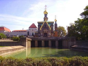 Keywords: orthodox church spires buildings architecture religion sky clouds pond water reflections outside plants trees spring summer columns darmstadt hessen germany