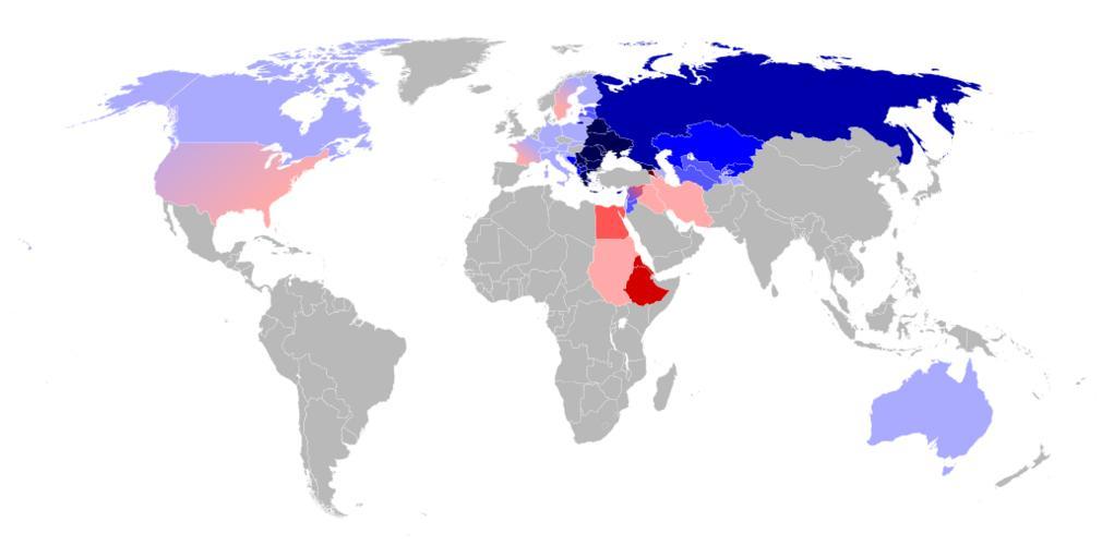Keywords: Orthodoxy by Country.svg Distribution of Orthodox Christianity in the world by country Eastern Orthodoxy legend 000055 Main religion more than 75 0000aa Main religion 50 - 75 0000ff Important minority religion 20 - 50 5555ff Important minority religion 5 - 20 aaaaff Minority religion 1 - 5 Oriental Orthodoxy 550000 Main religion more than 75 d40000 Main religion 50 - 75 ff0000 Important minority religion 20 - 50 ff5555 Important minority religion 5 - 20 ffaaaa Minority religion 1 - 5 Transferred from http //en wikipedia org en wikipedia; transferred to Commons by User Rafy using http //tools wikimedia de/~magnus/commonshelper php CommonsHelper <br/> Original text I <span style color 000066; padding 3px; >λ τερ ιξ</span><sup style color 666666; >talk</sup> created this work entirely by myself 01 15 23 December 2010 UTC <br/> 2010 12 23 first version ; 2010 12 23 last version <span style color 000066; padding 3px; >λ τερ ιξ</span><sup style color 666666; >talk</sup> Original uploader was Lanternix at http //en wikipedia org en wikipedia CC-ZERO Lanternix at http //en wikipedia org en wikipedia Cc-zero Original upload log page en wikipedia Orthodoxy_by_Country svg 2010-12-23 02 51 Lanternix 1376660 65002 bytes <nowiki></nowiki> 2010-12-23 02 50 Lanternix 1350625 1735 bytes <nowiki></nowiki> 2010-12-23 01 15 Lanternix 1350625 46486 bytes <nowiki> I ~~~ created this work entirely by myself ~~~~~ ~~~ </nowiki> ImageNote 1 966 284 14 16 1410 715 2 Oriental Orthodoxy is very old in India Many Oriental Orthodoxy Churches exist in Indian state of Kerala However they represent less than 1 of the total population of India so they are not marked on this map ImageNoteEnd 1 help I want to add India as oriental orthodox Christian as there are many Oriental orthodox in India specially in the Indian state of Kerala They are less than 1 of the population of India - 0 4 to be precise So they should not be added unless we change the official parameters of the map so that countries with less than 1 Orthodox Christians are also marked a change that would also affect other countries besides India Eastern Orthodox Church maps Christian distribution maps of the world Maps needing South Sudan political boundaries