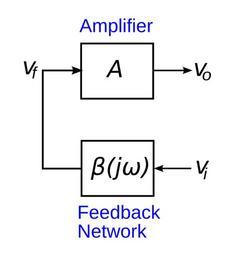 | Keywords: Oscillator diagram2.svg Block diagram of an electronic oscillator circuit with the feedback loop broken to show how to calculate the loop gain It consists of an amplifier element with amplification A with its output V<sub>o</sub> fed back into its input V<sub>i</sub> through a feedback network with transfer function β jω The loop gain is equal to <br> <math>G \frac v_o v_i \frac v_f v_i \frac v_o v_f \beta A j \omega \ </math> own 2009-06-23 Chetvorno I Chetvorno Chris Burks release this image to the public domain for any use whatever Image Oscillator diagram1 svg is the same image with the feedback loop unbroken Electronic oscillators Feedback loops Oscillator circuits |