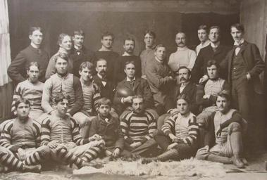 | Keywords: osgoode hall law school osgoodehalllawschool rugby rugby football rugbyfootball law students lawstudents men group portrait groupportrait 1897 stripes monochrome Date: 1897 Photographer: The Bryce Studio Reference code: P829 Depicted are T. Rigney (Coach), C.A. Moss, R. Ayre (Treasurer), W.C. Michell, Fred Wilson, H.V. Duggan, Fred Maclennan, M. White (Trainer), W.A. Hardisty, C. Flood, T.C. Church (Manager), Jack Strathy, W.R. Wadsworth, F. Lorne Cosby, His Honor Judge Morson (Hon. Pres.), Courtney Kingstone (Capt.), J.W. Curry (Pres.), R.H. Parmenter, C.F. Atkinson, G.K. Labatt, "Jimmy" (Mascot), J.D. McMurrich, Joe Syer, N.C. Jones. Date: 1897 Photographer: The Bryce Studio Reference code: P829 Depicted are T. Rigney (Coach), C.A. Moss, R. Ayre (Treasurer), W.C. Michell, Fred Wilson, H.V. Duggan, Fred Maclennan, M. White (Trainer), W.A. Hardisty, C. Flood, T.C. Church (Manager), Jack Strathy, W.R. Wadsworth, F. Lorne Cosby, His Honor Judge Morson (Hon. Pres.), Courtney Kingstone (Capt.), J.W. Curry (Pres.), R.H. Parmenter, C.F. Atkinson, G.K. Labatt, "Jimmy" (Mascot), J.D. McMurrich, Joe Syer, N.C. Jones. |