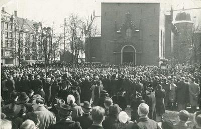 | Keywords: kirke oslo norway protest krig war hird publikum gudstejeste riksarkivet crowd people outdoor Beskrivelse: Langfredag 3. april 1942 utenfor domkirken i Oslo. Et tusentalls mennesker hadde møtt opp for å høre gudstjenesten til den avsatte biskop Eivind Berggrav. Imidlertid var biskopen nektet å forrette og arrestert av myndighetene. I protest sang folk ”Gud signe vårt dyre fedreland” og ”Ja vi elsker” utenfor kirken. Hird og politi forsøkte forgjeves å spre mengden. Fotograf: Ukjent Arkivreferanse: Riksarkivet, PA-1209 NTBs krigsarkiv/Ue/L0099/Livet i Norge under okkupasjonen Good Friday April 3rd 1942 outside Oslo Domkirke. Around a thousand people had come to listen to the sermon of the dismissed bishop. However, the bishop was refused to conduct and arrested by the authorities. To protest, people sang”Gud signe vårt dyre fedreland” and ”Ja vi elsker”, outside the church. NS political troops and the police tried in vain to spread the crowd. Photographer: Unknown Archival reference: Riksarkivet, PA-1209 NTBs krigsarkiv/Ue/L0099/Livet i Norge under okkupasjonen Url: www.arkivverket.no/arkivverket/Tema/Andre-verdenskrig-i-N... Beskrivelse: Langfredag 3. april 1942 utenfor domkirken i Oslo. Et tusentalls mennesker hadde møtt opp for å høre gudstjenesten til den avsatte biskop Eivind Berggrav. Imidlertid var biskopen nektet å forrette og arrestert av myndighetene. I protest sang folk ”Gud signe vårt dyre fedreland” og ”Ja vi elsker” utenfor kirken. Hird og politi forsøkte forgjeves å spre mengden. Fotograf: Ukjent Arkivreferanse: Riksarkivet, PA-1209 NTBs krigsarkiv/Ue/L0099/Livet i Norge under okkupasjonen Good Friday April 3rd 1942 outside Oslo Domkirke. Around a thousand people had come to listen to the sermon of the dismissed bishop. However, the bishop was refused to conduct and arrested by the authorities. To protest, people sang”Gud signe vårt dyre fedreland” and ”Ja vi elsker”, outside the church. NS political troops and the police tried in vain to spread the crowd. Photographer: Unknown Archival reference: Riksarkivet, PA-1209 NTBs krigsarkiv/Ue/L0099/Livet i Norge under okkupasjonen Url: www.arkivverket.no/arkivverket/Tema/Andre-verdenskrig-i-N... |