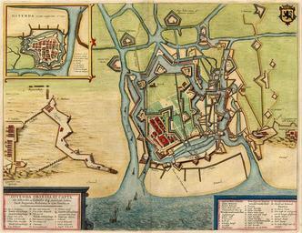 | Keywords: Ostenda obsessa et capta.jpg Ostenda obsessa et capta Mapa de la ciudad de Ostende durante el sitio de 1601 - 1604; el norte en la parte inferior Obra de Joan Blaeu hacia 1649 grabado de 37 x 49 cm Abajo el Mar del Norte En el centro en rojo los edificios de la ciudad vieja junto al puerto separada de la parte nueva en verde por un canal El canal que aparece a la izquierda de la ciudad es el Geule por donde los barcos circulaban hacia el puerto El canal de la derecha es el Old Haven Entre éste y la ciudad un sistema de esclusas marrón controlaban el flujo de agua hacia los fosos Alrededor de la ciudad en la parte exterior del canal que la rodea las construcciones poligonales con el vértice hacia el exterior son los baluartes holandeses En la parte izquierda de la imagen aparece el cuartel de los tercios bajo el mando del conde de Bucquoy; la construcción en línea quebrada es el dique levantado por éstos para servir de soporte a la artillería que intentaba impedir el tráfico de barcos hacia la ciudad El terreno sobre el que se asentaba era inundado en la pleamar Al oeste derecha con los vértices hacia la ciudad las líneas del archiduque Alberto de Austria En el cuadrante superior izquierdo vista de la ciudad con el norte arriba Mapa del sitio de Ostende de 1601 - 1604 http //www sanderusmaps com/antique-maps/europe/oostende_4340 cfm 1649 creator Joan Blaeu PD-old-100 Maps by Willem and Johannes Blaeu 1649 Old maps of Ostend Military history of Spain Siege of Ostend |