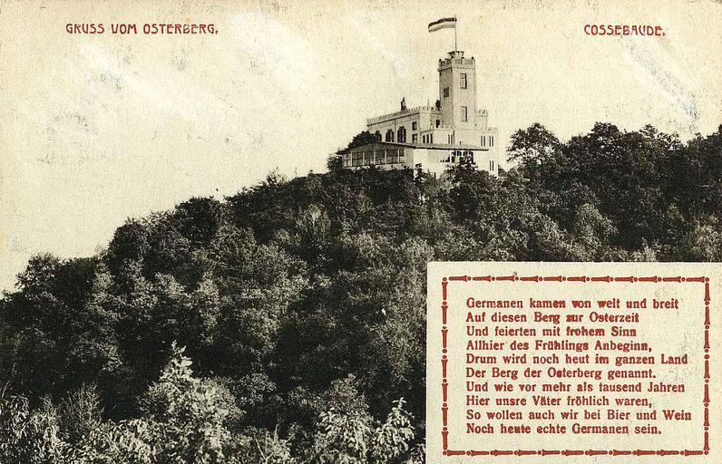 | Keywords: Osterberg germanen.jpg en Restaurant Osterberg near Cossebaude is could be a meeting point of the old germans de Restaurant Osterberg bei Cossebaude angeblich Treffpunkt der alten Germanen Ansichtskarte Kupferdruck von Seibt Meissen Freital 1918 PD-old Cossebaude |