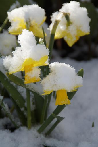 Keywords: osterglocken daffodils snowy snow winter blast april yellow spring flower bloom plant narcissus pseudonarcissus end of winter weather april weather