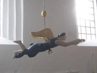Keywords: Osterhever – St. Martins-Kirche 2.jpg de Ein Aushang in der Kirche informiert Vermutlich 1822 wurde ein alter Taufstein durch einen Taufengel ersetzt Im Allgemeinen wurden Taufengel an einem Seil befestigt das über eine Rolle mit einem Gegengewicht verbunden war Wie bei unserem Engel war in der Gürtelregion eine Öse befestigt Mit Hilfe eine Stange mit Haken konnte der Taufengel dann aus seiner erhöhten Position zur Taufhandlung herabgezogen werden So hatte man bei den Gottesdiensten mehr Platz in der Kirche Die Taufschale die in den Kranz den der Engel in seinen Händen hält eingefügt wurde fehlt leider Der Taufengel war bis um 2010 auf dem Boden der Kirche eingelagert und wurde nach einer Restaurierung wieder aufgehängt own Klaaschwotzer 2013-09-07 St -Martins-Kirche Osterhever Cc-zero