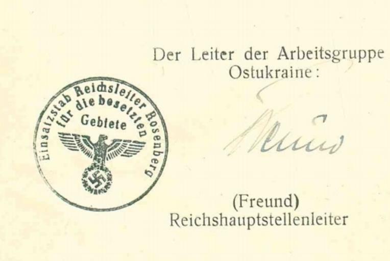 Keywords: Ostukraineseal1942.jpg de Stempel der Leitung der Arbeitsgruppe Ostukraine Einsatzstabs Reichsleiter Rosenberg CDVAVO image copy by User Jo0doe 1942 PD-Ukraine Einsatzstab Reichsleiter Rosenberg Rubber stamp imprints