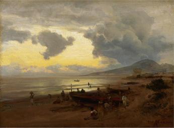 | Keywords: Oswald Achenbach - Sonnenuntergang am Strand.jpg artwork Creator Oswald Achenbach oil on canvas cm 29 8 38 7 O J W Achenbach ~ lower right signature http //www sothebys com/de/auctions/ecatalogue/2007/19th-century-european-art-n08355/lot 227 lotnum html Sotheby's New York 23 Oktober 2007 lot 227 PD-old-auto-1923 1905 Paintings by Oswald Achenbach Oil paintings of seascapes Landscape paintings of Italy Naples 19th-century landscape paintings Images from Sotheby's | ||||