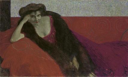 | Keywords: Otto Friedrich - Dame in Roth.jpg Dame in Roth oil on canvas in 34 5 57 5 own Private collection Schweiz 1909 Otto Friedrich 1862-1937 seit 1 1 2008 gemeinfrei Ursprünglich von Benutzer S baumann auf de WP hochgeladen PD-old Otto Friedrich Portrait paintings of recumbent women |