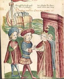 | Keywords: Otto IV. und Papst Innocenz III. reichen sich vor den ankommenden Schiffen Friedrichs II. die Hände.jpg Otto IV und Papst Innocenz III reichen sich vor den ankommenden Schiffen Friedrichs II die Hände Werkstatt des Diebold Lauber unbekannter Künstler Zeichnung ganzseitig ungerahmt Feder koloriert Wasserfarbe Deckfarbe Kaiser Otto IV der sich Begleitung zweier Höflinge befindet und Papst Innozenz III der in Begleitung eines Kardinals unter einem Stadttor steht reichen sich beide Hände Die Darstellung des Vordergrundes dürfte sich somit auf den Romzug Ottos IV 1209 beziehen Im Hintergrund nähert sich aber bereits ein Schiff mit den Truppen Friedrichs II der erst 1212 gegen Otto IV aufbrach Die Hände des Papstes und der Bildmittelgrund blieben unvollendet PD-Art Otto IV Holy Roman Emperor Universitätsbibliothek Heidelberg Cod Pal germ 149 Frederick II Holy Roman Emperor Innocentius III in miniatures Diebold Lauber Artworks missing infobox template |