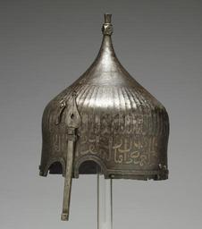 | Keywords: Ottoman or Persian - Turban Helmet with Eye Holes - Walters 5170 - Three Quarter Left.jpg A warrior would have worn this helmet over a cloth turban He would have been confident of being safeguarded in battle by the writing around the helmet's rim The inscription from the Qur'an is garbled however indicating that its Iranian maker may not have known Arabic Yet the presence of Arabic writing apparently was thought to be enough to invoke the protective power of God's word This helmet once belonged to the St Irene royal arsenal in Istanbul Turkey as it bears the distinctive mark tamga composed of a circle enclosing a loop over three vertical lines the stamp is clearly visible to the left of the nose guard on this helmet It was probably part of the war booty amassed by the Ottoman Dynasty during the many wars between Turkey and Iran Later it was owned by the French painter Jean-Léon Gérôme who traveled throughout the Near East and painted many scenes of Muslim life ca 1450 1500 late Medieval steel with silver inlay cm 38 5 23 4 h x diam accession number 51 70 6002 Armory of Constantinople Jean-Léon Gérome Collection Dikran Kelekian New York and Paris Henry Walters city Baltimore Walters Art Museum Henry Walters Acquired by Henry Walters 1913 place of origin east Turkey Ottoman or northwest Iran Persia Walters Art Museum license Islamic metalwork in the Walters Art Museum Indo-Persian armour in the Walters Art Museum Media contributed by the Walters Art Museum needs artist review 15th-century helmets Turban helmets |