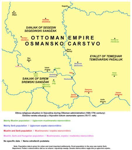 | Keywords: Ottoman vojvodina ethnicity religion.png Summary / Opis en Ethno-religious situation in Vojvodina during Ottoman administration 16th-17th century sr Etničko-verska situacija u Vojvodini tokom osmanske uprave 16-17 vek own PANONIAN 2010 Licensing / Licenca References / Reference Dr Dušan J Popović Srbi u Vojvodini knjiga 1 Novi Sad 1990 general data about ethnic and religious situation in Vojvodina during Ottoman administration as well as detailed data about population of several settlements - opšti podaci o etničkoj i verskoj situaciji u Vojvodini tokom osmanske uprave kao i detaljni podaci o stanovništvu nekoliko naselja - pages 110-114 212-213 248-263 / strane 110-114 212-213 248-263 Dr Dušan Popov Petrovaradinska tvrđava Enciklopedija Novog Sada knjiga 20 Novi Sad 2002 data about population of Varadin - podaci o stanovništvu Varadina Žarko Dimić Sremski Karlovci Enciklopedija Novog Sada knjiga 26 Novi Sad 2005 data about population of Karlovci - podaci o stanovništvu Karlovaca Marko Jovanov Devet vekova od pomena imena Titela Titelski letopis Titel 2001 data about population of Titel - podaci o stanovništvu Titela Milan Tutorov Banatska rapsodija - istorika Zrenjanina i Banata Novi Sad 2001 data about population of Bečkerek - podaci o stanovništvu Bečkereka Dušan Belča Mala istorija Vršca Vršac 1997 data about population of Vršac - podaci o stanovništvu Vršca Antun Dević - Blaž Zmaić Župa Irig Irig 2010 data about population of Irig - podaci o stanovništvu Iriga Jovan Erdeljanović Srbi u Banatu Novi Sad 1992 data about population of Pančevo - podaci o stanovništvu Pančeva http //www yumreza org yu/irig/Istorija_Iriga/opsti_podaci htm data about population of Irig - podaci o stanovništvu Iriga http //www pancevo com/town/history/ data about population of Pančevo - podaci o stanovništvu Pančeva http //www nocmuzeja rs/Gradovi/Pancevo/Turisticka-organizacija-Panceva data about population of Pančevo - podaci o stanovništvu Pančeva http //digilander libero it/zivoslav/pancevo htm data about population of Pančevo - podaci o stanovništvu Pančeva http //e-zemun rs/zemun/istorija/kratka-istorija-zemuna/ data about population of Zemun - podaci o stanovništvu Zemuna http //diurnarius info/index php/sr/istorija/16-opispalanke data about population of Subotica - podaci o stanovništvu Subotice Place names / Imena mesta wikitable style text-align right - Turkish name<br>Tursko ime Former Serbian name<br>Bivše srpsko ime Modern Serbian name<br>Moderno srpsko ime Names in other languages<br>Imena na drugim jezicima - Segedin Segedin Segedin Szeged Hungarian mađarski - Baya Baja Baja Baja Hungarian mađarski - Sobotka Subotica Subotica - - Sonbor Sombor Sombor - - Baç Bač Bač - - Vukot Futog Futog - - Titel Titel Titel - - Beçe Bečej Novi Bečej - - Beçkerek Bečkerek Zrenjanin - - Temeşvar Temišvar Temišvar Timişoara Romanian rumunski - Verşe Vršac Vršac - - Haram Palanka Banatska Palanka - - Pançova Pančevo Pančevo - - Kufin Kovin Kovin - - Zemlin Zemun Zemun - - Slankamen Slankamen Stari Slankamen - - İrig Irig Irig - - Karlofça Karlovci Sremski Karlovci - - Varadin Varadin Petrovaradin - - Mitroviçe Mitrovica Sremska Mitrovica - - Uyluk Ilok Ilok Ilok Croatian hrvatski - Vukovar Vukovar Vukovar Vukovar Croatian hrvatski Historical maps of ethnic groups in Vojvodina Historical maps of ethnic groups in Serbia Historical maps of religion in Vojvodina Historical maps of religion in Serbia Maps of the history of Banat Maps of the history of Bačka Maps of the history of Syrmia Maps of the Ottoman Empire in the 16th-century Maps of the Ottoman Empire in the 17th-century Maps of the Bosniaks Maps of the Serbs Maps of the Hungarians Maps in Serbian Demographic Maps of the Ottoman Empire |