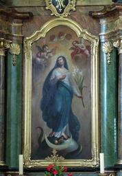 | Keywords: Ottrott StsSimon-Jude10.JPG Alsace Bas-Rhin Ottrott Église Saint-Simon et Saint-Jude Autel secondaire Immaculée Conception XVIIIe own 2014 Ralph Hammann cc-by-sa-4 0 PM67000686 IM67001070 Artwork / Œuvre d'art / Kunstwerk Artist Vierge couronnement avec coeur ardent à guirlande de roses 1833 oil canvas cm Église Saint-Simon et Saint-Jude Ottrott Autel secondaire gauche IM67001070 object history Les peintures proviennent de l'ancien couvent de Saint-Léonard à Boersch ; œuvres réalisées en Alsace other versions Ralph Hammann PD-old accession number Taken with Canon PowerShot SX20 IS Photographs of Ottrott by Ralph Hammann Autels secondaires Église Saints-Simon-et-Jude d'Ottrott Neoclassical church paintings in Alsace Objets monuments historiques in Bas-Rhin church paintings 19th-century church paintings in Alsace Details of 19th-century paintings 1833 oil on canvas paintings in France 1833 works in Alsace 19th-century paintings of Immaculata Paintings of putti in France 19th-century paintings of putti |