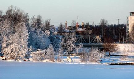 Keywords: oulu finland bridge buildings lake frozen trees sky clouds city cities nature outside winter snow ice
