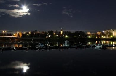 Keywords: oulu finland city cities urban skyline night evening moon moonlight harbor bay water reflections silhouettes architecture