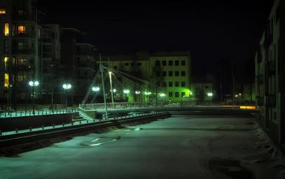 Keywords: oulu finland night evening lights lighting buildings reflections architecture pedestrian bridge frozen canal winter snow ice