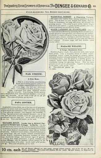 | Keywords: Our new guide to rose culture (16385423989).jpg ThELHadiniRnHEErawEFsnfAmEFiDa lBeDIfJGEE gCONARD 53 <br> KVER-BLQQMING TEA ROSES ” CONTINUED <br> This is a very lovely ever-blooming <br> Rose and is always greatly admired by <br> all; It makes elegant buds and the flowers <br> are extra large very full and deliciously <br> sweet; color bright rosy flesh passing to clear <br> rose brightened with pink elegantly shaded <br> and very beautiful It is a strong healthy grower <br> and a wonderfully free and constant bloomer; very hand- <br> some and desirable 10 cts each; 6 for 50 cts ; r per <br> dozen Two-year-old plants 30 cts each <br> PAPA GONTIER <br> A splendid crimson Rose one of the best for all purposes; <br> it makes inr -nense buds and magnificent large bold flowers <br> of great depth and substance ; color rich cherry red passing <br> to clear glowing crimson; very fragrant and beautiful; a <br> strong vigorous grower and constant bloomer; one of the <br> very best and most valuable both for open ground and <br> greenhouse see cut page 52 10 cts each ; 6 for 50 cts ; <br> 1 per doz Two-year-old plants 30 cts each <br> MADAME RIVOY Looks like a Hybrid Per- <br> petual in Flower and Foliage Is Hardy ” In this <br> grand old variety we have a Rose of no ordinary excellence <br> It is entitled to a place among Ever-blooming Roses equal <br> to that which General Jacqueminot takes among Hybrid <br> Perpetuals Indeed it is not unlike a Hybrid Perpetual in <br> the extra-large full and loosely formed crimson-scarlet <br> double flowers enchanting fragrance intensity of color <br> large handsome foliage and extreme vigor <br> it is hardy with slight protection a quick constant <br> profuse blbomer and for butdoor culture canno <br> celled by any Rose of its color 15 cts each ; 4 for 50 cts ; <br> 9 for i Two-year-old plants 30 cts each <br> MARECHAL ROBERT Charming Variety <br> ” We select this variety from among hundreds as extra <br> good The flowers are full double and sweet ; they are <br> borne in abundance on long stiff stems all through the <br> growing season The color is pure white faintly tinged <br> with blush and yellow ; a good healthy grower and alto- <br> gether a pleasing and satisfactory Rose <br> MARIE LAMBERT OR SNOWFLAKE Qne of <br> the best and freest flowering blooming Roses in cultivation <br> equally good for open-ground cultivation and pot culture <br> Outdoors it is especially good being unusually hardy very <br> vigorous and a certain continuous and free bloomer On <br> a siii'gle plant only nine months old 143 buds and flowers <br> were counted Flowers large full and double ; color <br> creamy white <br> MADAME WELCHE <br> A Large Handsome Rose <br> Flowers of great depth ; fine globular form with broad <br> thick petals; color a beautiful shade of amber yellow <br> deepening toward centre to orange or coppery yellow <br> delicately clouded with pale crimson ; flowers and buds are <br> remarkably sweet and the plant is a healthy grower of <br> compact bushy habit producing buds and flowers in <br> abundance during the growing season Fine for open <br> ground as well as for greenhouse Superb in every way <br> 15 cts each ; 4 for 50 cts ; 9 for <br> 1 Two-year-old plants 30 <br> cts each - - / ~ <br> y ot color lyt <br> of growth ; m d <br> instant and n <br> mot be 'ex- L' <br> A f\ T for all Roses offered on tills page except where noted; any 6 for 50 cts ; 1 per <br> III ClS 3 Cn dozen postpaid Two-year-old plants 30 cts each; 8 per dozen by Express at <br> wv »» » vw purchaser's expense 43875640 149643 77861 Page 53 Text http //www biodiversitylibrary org/page/43875640 1891 10 5962/bhl title 77861 Dingee Conard Co ; Henry G Gilbert Nursery and Seed Trade Catalog Collection Biodiversity Heritage Library Our new guide to rose culture 1900 Garden Stories Catalogs Dingee Conard Co Flowers Nurseries Horticulture Nursery stock Roses Seeds Trade catalogs U S Department of Agriculture National Agricultural Library bhl page 43875640 dc identifier http //biodiversitylibrary org/page/43875640 bhlGardenStories Madame Welche Madame Etienne Tea Roses BHLinbloom dingee conard co nurseries horticulture u s department of agriculture national agricultural library bhlgardenstories madame welche madame etienne tea roses bhlinbloom Information field Flickr posted date ISOdate 2015-02-18 Check categories 2015 August 24 CC-BY-2 0 BioDivLibrary https //flickr com/photos/61021753 N02/16385423989 2015-08-24 03 52 16 cc-by-2 0 PD-old-70-1923 Our new guide to rose culture 1891 Photos uploaded from Flickr by Fæ using a script |