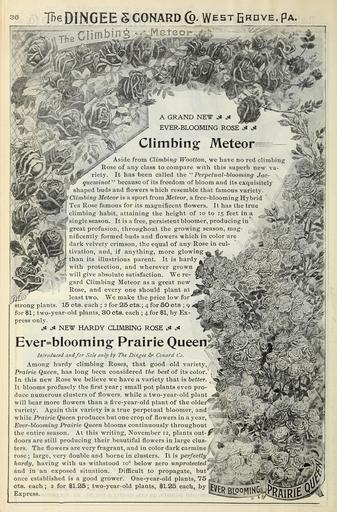 Keywords: Our new guide to rose culture (16545688086).jpg 36 <br> l e DINGEE § CONARD b West Erove Pa <br> n- - Glimbin _tj J istaBI <br> V2 ' <br> A GRAND NEW <br> EVER-BLOOMING ROSE ji <br> Climbing Meteor <br> i \ <br> 'fi' ' f' Aside from Climbing Wootton we have no red climbing <br> Rose of any class to compare with this superb new va <br> riety It has been called the Perpetual-blooming Jac- –  <br> queminof because of its freedom of bloom and its exquisitely <br> shaped buds and flowers which resemble that famous variety <br> Climbing Meteor is a sport from Meteor a free-blooming Hybrid <br> Tea Rose famous for its magnificent flowers It has the true <br> climbing habit attaining the height of lo to 15 feet in a <br> single season It is a free persistent bloomer producing in <br> great profusion throughout the growing season mag- <br> nificently formed buds and flowers which in color are <br> dark velvety crimson the equal of any Rose in cul- <br> tivation and if anything more glowing <br> than its illustrious parent It is hardy <br> with protection and wherever grown <br> will give absolute satisfaction We re- <br> gard Climbing Meteor as a great new <br> Rose and every one should plant at <br> least two We make the price low for <br> strong plants 15 cts each ; 2 for 25 cts ; 4 for 50 cts ; 9 <br> for 1 ; two-year-old plants 30 cts each ; 4 for 1 by Ex- <br> press only <br> i« NEW HARDY CLIMBING ROSE <br> Ever blooming Prairie Queen <br> t ' <br> Introduced and for Sale only by The Dmgee 6 Ccnard Co <br> Among hardy climbing Roses that good old variety <br> Prairie Queen has long been considered the best of its color <br> In this new Rose we believe we have a variety that is better <br> It blooms profusely the first year ; small pot plants even pro- <br> duce numerous clusters of flowers while a two-year-old plant <br> will bear more flowers than a five-year-old plant of the older <br> variety Again this variety is a true perpetual bloomer and <br> while Prairie Queen produces but one crop of flowers in a year <br> Ever-blooming Prairie Queen blooms continuously throughout <br> the entire season At this writing November 12 plants out- ' <br> doors are still producing their beautiful flowers in large clus- <br> ters The flowers are very fragrant and in color dark carmine <br> rose ; large very double and borne in clusters It is perfectly' <br> hardy having with us withstood 10° below zero unprotected <br> and in an exposed situation Difficult to propagate but <br> once established is a good grower One-year-old plants 75 <br> cts each ; 2 for 1 25 ; two-year-old plants 1 25 each by <br> Express <br> l ER BLooMiHOk 43875623 149643 77861 Page 36 Text http //www biodiversitylibrary org/page/43875623 1891 10 5962/bhl title 77861 Dingee Conard Co ; Henry G Gilbert Nursery and Seed Trade Catalog Collection Biodiversity Heritage Library Our new guide to rose culture 1900 Garden Stories Catalogs Dingee Conard Co Flowers Nurseries Horticulture Nursery stock Roses Seeds Trade catalogs U S Department of Agriculture National Agricultural Library bhl page 43875623 dc identifier http //biodiversitylibrary org/page/43875623 bhlGardenStories Climbing Meteor Prairie Queen BHLinbloom dingee conard co nurseries horticulture u s department of agriculture national agricultural library bhlgardenstories climbing meteor prairie queen bhlinbloom Information field Flickr posted date ISOdate 2015-02-18 Check categories 2015 August 24 CC-BY-2 0 BioDivLibrary https //flickr com/photos/61021753 N02/16545688086 2015-08-24 03 54 33 cc-by-2 0 PD-old-70-1923 Our new guide to rose culture 1891 Photos uploaded from Flickr by Fæ using a script