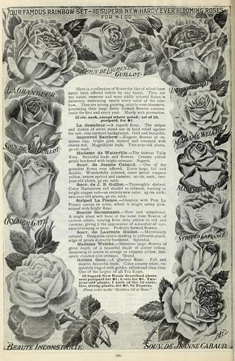 | Keywords: Our new guide to rose culture (16545677856).jpg Here is a collection of Roses the like of which have <br> never been offered before by any house They are <br> the rarest sweetest and most oddly colored Roses in <br> existence embracing nearly every color of the rain- <br> bow They are strong growing strictly ever-bloomers <br> producing their large finely formed flowers continu- <br> ously the first and every year Hardy with protection <br> 15 cts each except where noted ; set of 10 <br> postpaid for 1 <br> La Grandeur A superb Rose The stripes <br> and dashes of white stand out in bold relief against <br> the soft rosy carmine background Odd and beautiful <br> Improved Rainbow Elegant flowers of im- <br> mense size; bright pink dashed and streaked with <br> cherry red Magnificent buds Two-year-old plants <br> 30 cts each <br> Madame de WaUeville The famous Tulip <br> Rose Beautiful buds and flowers Creamy yellow <br> petals bordered with bright crimson Superb <br> Souv de Jeanne Cabaud One of the <br> grandest Roses ever offered Extra large full and <br> double Wonderfully colored outer petals coppery <br> yellow centre apricot and carmine 20 cts each ; two- <br> year-old plants 35 cts each <br> Souv de J B Guillot Thoroughly distinct <br> Color Nasturtium red shaded to crimson varying to <br> bright copper red an entirely new color 25 cts each; <br> two-year-old plants 40 cts each <br> Striped La France Identical with Pmk La <br> France except in color which is bright satiny pink <br> striped with bright Rose <br> Beaute Inconstante New and sensational <br> A single plant will have at the same time flowers of <br> various colors varying from deep yellow to red and <br> carmine giving it the appearance of a number of vari- <br> eties blooming at once Perfectly formed flowers <br> Souv de Laurents Guillot Marvelously <br> colored Deep pink centre shading to yellowish peach <br> edge of petals distinctly bordered Splendid <br> Madame Welche Immense large flowers of <br> great depth of a beautiful shade of amber yellow <br> deepening in centre to orange or coppery yellow deli- <br> cately clouded pale crimson Grand <br> Golden Gate A glorious Rose Full and <br> double beautiful buds Color creamy white ex- <br> quisitely tinged with golden yellow and clear rose <br> One of the largest of all Tea Roses <br> 10 Superb New Roses described above <br> sent postpaid for SI ; G sets for jp Two- <br> year-old plants 1 each of the 10 varie- <br> ties strong plants for S J by Express <br> Please order oÂŤ the Rainbow Set of Roses <br> 30 43875617 149643 77861 Page 30 Text http //www biodiversitylibrary org/page/43875617 1891 10 5962/bhl title 77861 Dingee Conard Co ; Henry G Gilbert Nursery and Seed Trade Catalog Collection Biodiversity Heritage Library Our new guide to rose culture 1900 Garden Stories Catalogs Dingee Conard Co Flowers Nurseries Horticulture Nursery stock Roses Seeds Trade catalogs U S Department of Agriculture National Agricultural Library bhl page 43875617 dc identifier http //biodiversitylibrary org/page/43875617 bhlGardenStories Ever Blooming Roses BHLinbloom dingee conard co nurseries horticulture u s department of agriculture national agricultural library bhlgardenstories ever blooming roses bhlinbloom Information field Flickr posted date ISOdate 2015-02-18 Check categories 2015 August 24 CC-BY-2 0 BioDivLibrary https //flickr com/photos/61021753 N02/16545677856 2015-08-24 03 50 32 cc-by-2 0 PD-old-70-1923 Our new guide to rose culture 1891 Photos uploaded from Flickr by FĂŚ using a script |