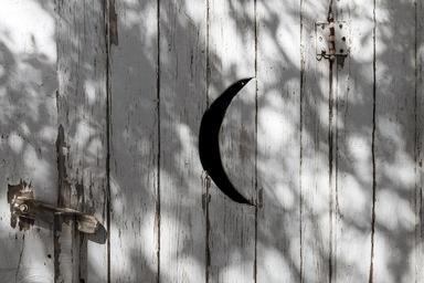 Keywords: outhouse door wooden toilet outdoors restroom latrine rural building vintage architecture shack rustic old country facility traditional moon countryside structure weathered carved shape shadows