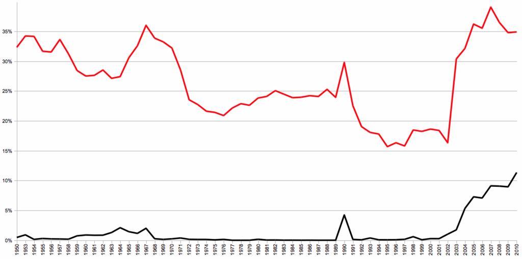 | Keywords: Overseas Troops.gif  en Red line on this chart represents the share of the overseas troops of the USA based on the data from the United States Department of Defense Black line represents troops that fall under 'Undistributed' category in the reports e g no country of dislocation is indicated There is no data for years 1951 and 1952 --- period of the Korean War Since 2003 deployments to Afghanistan and Iraq/Kuwait are counted separately Operation Enduring Freedom Operation Iraqi Freedom Operation New Dawn however those troops have been deployed mostly from the Continental US thus they were added to 'Total - Foreign Countries' category numbers 'Total - Undistributed' is already included in 'Total - Foreign Countries' in the reports For September 2010 an estimate of 219 190 troops are in OND and OEF category plus 162 437 troops are in 'Undistributed' category making a total of 381 627 troops not stationed in the 'allied countries' The data for the chart calculation is below http //siadapp dmdc osd mil/personnel/MILITARY/miltop htm Military Personnel Statistics http //siadapp dmdc osd mil/personnel/MILITARY/history/309hist htm Military Personnel Historical Reports Emilfaro en 2011-03-08 Emilfaro en wikitable style text-align right; center style background f0f0f0; Year center style background f0f0f0; Total troops center style background f0f0f0; Overseas center style background f0f0f0; Undistributed center style background f0f0f0; Overseas center style background f0f0f0; Undistributed - 1950 1 460 261 471 894 6 864 32 32 0 47 - 1953 3 555 067 1 216 688 32 438 34 22 0 91 - 1954 3 279 579 1 120 175 4 851 34 16 0 15 - 1955 2 930 863 927 851 8 651 31 66 0 30 - 1956 2 795 460 881 548 6 412 31 53 0 23 - 1957 2 758 069 927 537 5 893 33 63 0 21 - 1958 2 598 015 811 254 4 715 31 23 0 18 - 1959 2 492 449 708 618 18 503 28 43 0 74 - 1960 2 492 037 685 582 22 023 27 51 0 88 - 1961 2 552 912 705 109 21 513 27 62 0 84 - 1962 2 687 690 766 628 22 877 28 52 0 85 - 1963 2 695 240 731 045 34 991 27 12 1 30 - 1964 2 690 141 737 433 56 594 27 41 2 10 - 1965 2 723 800 832 364 39 106 30 56 1 44 - 1966 3 229 209 1 051 893 37 228 32 57 1 15 - 1967 3 411 931 1 228 538 68 428 36 01 2 01 - 1968 3 175 263 1 074 983 8 105 33 85 0 26 - 1969 3 132 766 1 041 094 4 601 33 23 0 15 - 1970 2 718 027 875 423 6 494 32 21 0 24 - 1971 2 392 412 682 672 9 109 28 53 0 38 - 1972 2 111 403 496 830 3 354 23 53 0 16 - 1973 2 006 926 456 242 2 776 22 73 0 14 - 1974 1 945 818 420 684 2 603 21 62 0 13 - 1975 1 901 661 407 287 1 213 21 42 0 06 - 1976 1 866 960 389 894 2 749 20 88 0 15 - 1977 2 074 543 459 385 99 22 14 0 00 - 1978 2 062 404 471 874 47 22 88 0 00 - 1979 2 027 494 458 424 112 22 61 0 01 - 1980 2 050 826 488 726 3 427 23 83 0 17 - 1981 2 082 897 501 832 756 24 09 0 04 - 1982 2 108 612 528 484 887 25 06 0 04 - 1983 2 123 349 519 517 331 24 47 0 02 - 1984 2 138 157 510 730 413 23 89 0 02 - 1985 2 151 032 515 367 223 23 96 0 01 - 1986 2 169 112 525 328 329 24 22 0 02 - 1987 2 174 217 523 702 155 24 09 0 01 - 1988 2 138 213 540 588 157 25 28 0 01 - 1989 2 130 229 509 873 128 23 94 0 01 - 1990 2 046 144 609 422 86 776 29 78 4 24 - 1991 1 986 259 447 572 2 704 22 53 0 14 - 1992 1 807 177 344 065 1 381 19 04 0 08 - 1993 1 705 103 308 020 6 509 18 06 0 38 - 1994 1 610 490 286 594 1 279 17 80 0 08 - 1995 1 518 224 238 064 1 114 15 68 0 07 - 1996 1 471 722 240 421 1 276 16 34 0 09 - 1997 1 438 562 227 258 2 253 15 80 0 16 - 1998 1 406 830 259 871 8 488 18 47 0 60 - 1999 1 385 703 252 763 1 179 18 24 0 09 - 2000 1 384 338 257 817 3 775 18 62 0 27 - 2001 1 385 116 254 788 3 690 18 39 0 27 - 2002 1 411 634 230 484 14 426 16 33 1 02 - 2003 1 434 377 435 766 25 019 30 38 1 74 - 2004 1 426 836 458 449 76 172 32 13 5 34 - 2005 1 389 394 503 097 101 074 36 21 7 27 - 2006 1 384 968 491 967 97 983 35 52 7 07 - 2007 1 379 551 538 743 125 773 39 05 9 12 - 2008 1 401 757 511 250 127 147 36 47 9 07 - 2009 1 418 542 493 293 126 979 34 77 8 95 - 2010 1 430 985 499 386 162 437 34 90 11 35 United States armed forces abroad |