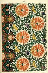 | Keywords: Owen Jones - Examples of Chinese Ornament - 1867 - plate 071.png 070 LXXI 71 072 From a painted china Jar The principle of composition on this bottle is the same as on Plates LXX and XLVI only the continuous line runs horizontally instead of spirally round the bottle and the repeat is moved one-half a division so as to bring the flowers into triangles To compose a pattern which shall do this and thoroughly and evenly fill up the space is not easy and is only attained by the Oriental instinct PD-old-100-1923 Porcelain of China Ceramic jars Floral designs in China Floral patterns |