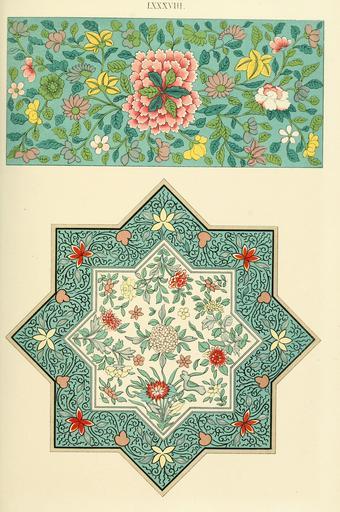 | Keywords: Owen Jones - Examples of Chinese Ornament - 1867 - plate 088.png 087 LXXXVIII 88 089 From painted china The upper composition is of the same Indian character as the last plate; the little dish in the form of a star has very much the same character The geometric arrangement of the groups of flowers without being rigidly accurate yet sufficiently so to properly balance is most artistic PD-old-100-1923 Porcelain of China Floral designs in China Floral patterns Eight pointed stars | ||||