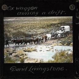 | Keywords: Ox-wagon Crossing Water, Africa, ca.1875-ca.1940 (imp-cswc-GB-237-CSWC47-LS16-027).jpg en <br> Ox-wagon Crossing Water Africa ca 1875-ca 1940 Photograph of an ox-wagon similar to the type that would have been used as transport by the Scottish missionary David Livingstone The wagon which is being driven by a number of oxen or cattle can be seen crossing a stream or a river The ox-wagon became David Livingstone and his familyas home on two extended journeys in 1850 and 1851 ; This belongs to a series of Church of Scotland Foreign Missions Committee lantern slides relating to David Livingstone 1813-1873 the Scottish missionary who was best known as an explorer of Africa and anti-slavery campaigner Livingstone was born in Blantyre Scotland and after working in the local cotton mill from the age of 10 he went on to study medicine and theology in Glasgow in 1836 Having decided to become a missionary he was posted to southern Africa in 1841 In 1845 he married Mary Moffat During his life Livingstone carried out exploration of southern eastern and central Africa he discovered and named the Victoria Falls and it was his meeting with H M Stanley during a search for the source of the Nile that gave rise to the popular quotation Dr Livingstone I presume David Livingstone died in Africa on 1 May 1873 and his body was buried in Westminster Abbey Photographer Unknown Subject personal name Livingstone David 1813-1873 Filename imp-cswc-GB-237-CSWC47-LS16-027 tif Coverage date circa 1875/1940 Part of collection International Mission Photography Archive ca 1860-ca 1960 Type images Part of subcollection Photographs from the Centre for the Study of World Christianity University of Edinburgh U K ca 1900-ca 1940s Repository name Centre for the Study of World Christianity Archival file impaunpub_Volume7/1860 url Repository address The University of Edinburgh School of Divinity New College Mound Place Edinburgh EH1 2LX United Kingdom Format aacr2 1 lantern slide 8 x 8 cm Geographic subject continent Africa Rights Contact the repository for details Part of series David Livingstone LS16 Repository email divinity-CSWC ed ac uk Subject lcsh Keyword Transportation; Livestock Date created circa 1875/1940 Publisher of the digital version University of Southern California Libraries Subject aat genre distant views Format aat lantern slides Legacy record ID impa-m69440 Access conditions http //www ed ac uk/schools-departments/divinity/research/centres/world-christianity/collections-resources File GB 237 CSWC47/LS16/27 circa 1875 /1940 author http //digitallibrary usc edu/cdm/ref/collection/p15799coll123/id/64976 PD-old-70-1923 Images from USC Digital Library uploaded by Fæ International Mission Photography Archive ca 1860-ca 1960 Ox-drawn wagons in South Africa Fords in South Africa Lantern slides of South Africa Magic lantern images Animal-drawn vehicles fording |