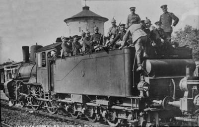 Keywords: P4 Lok mit Truppen.jpg German troops en route to Russia on a Prussian P 4 2 later DRG class 36 steam engine ca 1914 LOC-image ggbain 17757 ~ 1914 Bain News Service New York frame removed PD-USGov Prussian P 4
