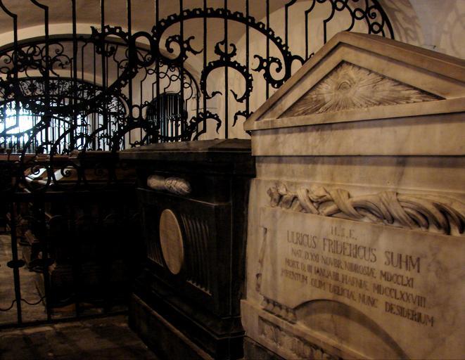 Keywords: P. F. Suhms sarkofag.JPG Peter Frederik Suhm og sønnen Ulrik Frederiks sarkofager i Christians Kirkes krypt Christianshavn Danmark own 2012-04 Orf3us Crypt under Christians Kirke Peter Frederik Suhm