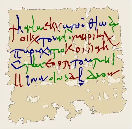 | Keywords: P.Oxy.6.993 text highlighted.svg  en Oxyrhynchus papyrus 6 993 see File P Oxy 6 993 jpeg for original photograph with text re-drawn and word divisions highlighted for illustration of Greek cursive script own Future Perfect at Sunrise 2011-10-01 150px Cc-zero Papyrus Oxyrhynchus 993 |