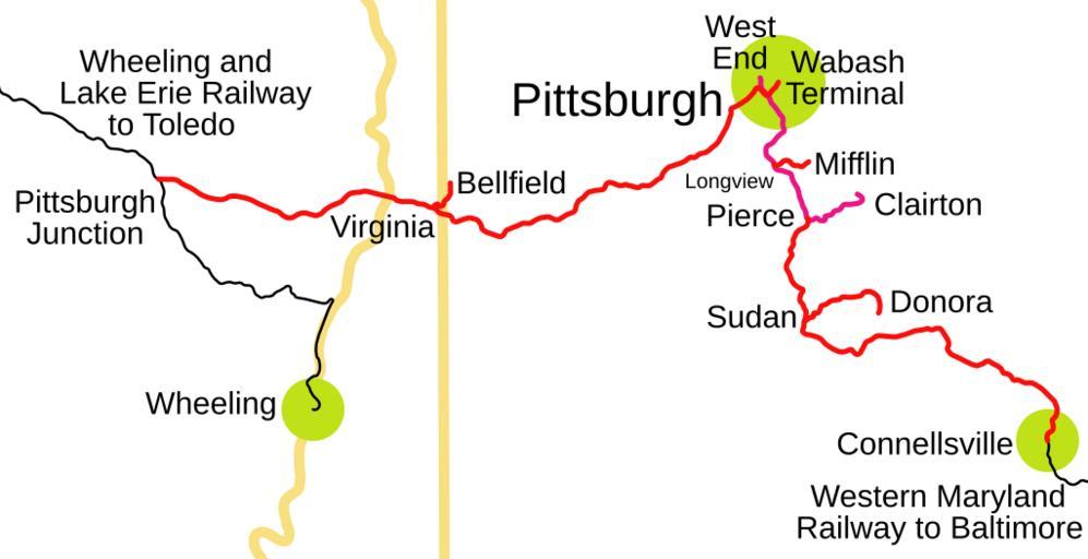 Keywords: P&WV map.svg spuimap Pittsburgh and West Virginia Railway traced on USGS topos Norfolk and Western Railway System maps of defunct U S railroads Wabash Pittsburgh Terminal