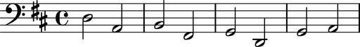 | Keywords: Pachelbel Canon bass line.svg The bass line of Pachelbel's Canon in D Created by bdesham with GNU LilyPond <br> v 2007-08-31 PD-old <gallery>Image Pachelbel Canon bass line png raster version Image Pachelbel Canon bass line quarter notes svg same thing with quarter notes</gallery> LilyPond source <pre> \version 2 10 15 tune \relative c \clef bass \key d \major \time 4/4 d2 a b fis g2 d g a \score \new Staff \tune \layout ragged-right t </pre> Compositions by Johann Pachelbel Sheet music examples Images with LilyPond source code |