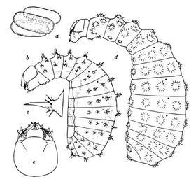 | Keywords: Pachycondyla.harpax.larvae.-.wheeler.svg Pachycondyla harpax a eggs b young larva c tubercle of young larva d adult larva e head of adult larva Wheeler W M 1900 A study of some Texan Ponerinae Biological Bulletin 2 1-31 http //antbase org/ants/publications/10486/10486 pdf PDF 1900 W M Wheeler pd-old pd-old Drawings of animals by William Morton Wheeler Drawings of ants | ||||