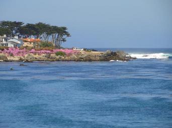 Keywords: pacific grove california sea ocean water sky clouds houses homes wildflowers coast coastline shoreline nature outside waves