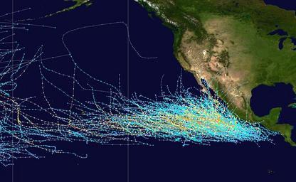 | Keywords: Pacific hurricane tracks 1980-2005.jpg right border 0 cellspacing 0 cellpadding 0 style background transparent;text-align center - 7 nowrap nowrap <small>Saffir-Simpson Hurricane Scale</small> - background-color 5ebaff;width 1 8em title Tropical Depression 0 “38 mph 0 “62 km/h TD background-color 00faf4;width 1 8em title Tropical Storm 39 “73 mph 63 “117 km/h TS background-color ffffcc;width 1 8em title Category 1 74 “95 mph 119 “153 km/h 1 background-color ffe775;width 1 8em title Category 2 96 “110 mph 154 “177 km/h 2 background-color ffc140;width 1 8em title Category 3 111 “130 mph 178 “209 km/h 3 background-color ff8f20;width 1 8em title Category 4 131 “155 mph 210 “249 km/h 4 background-color ff6060;width 1 8em title Category 5 > 156 mph > 250 km/h 5 This map shows the tracks of all Tropical cyclones in the Northeast Pacific Ocean from 1980 to 2005 Both the International Date Line and 140° W longitude are marked on the map The Date Line is the westernmost boundary of the basin and 140° W is the boundary between the Central and East Pacific The points show the locations of the storms at six-hourly intervals and use the color scheme shown above from Saffir-Simpson Hurricane Scale Created using User jdorje/Tracks by Nilfanion on 2007-02-19 Background image from Image Whole world - land and oceans jpg NASA The best track information is from the National Hurricane Center http //www nhc noaa gov/tracks1949to2006_epa txt Pacific hurricanes Cumulative Eastern Pacific hurricane trackmaps |