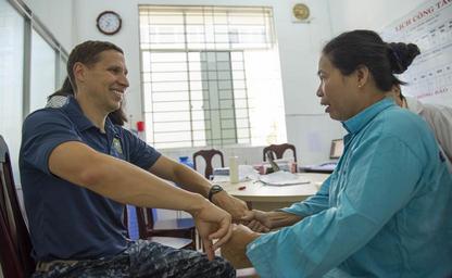 | Keywords: Pacific Partnership 160722-N-BB534-116.jpg en 160722-N-BB534-116 DA NANG Vietnam July 22 2016 Lt Cmdr Paul Porensky left a neurosurgeon assigned to Pacific Partnership 2016 assesses a patients grip at Da Nang General Hospital during a cooperative health engagement CHE During the CHE Porensky worked together with local surgeons to diagnose patients and perform surgeries Pacific Partnership is in Da Nang where hospital ship USNS Mercy T-AH 19 is joined by JS Shimokita LST-4002 and Vietnam People's Navy ship Khánh Hóa Partner nations are working work side-by-side with local organizations to conduct cooperative health engagements community relation events and subject matter expert exchanges to better prepare for natural disaster or crisis U S Navy photo by Mass Communication Specialist 1st Class Elizabeth Merriam/Released <br>Unit Defense Imagery Management Operations Center 2016-07-22 Petty Officer 1st Class Elizabeth Merriam https //www dvidshub net/image/2752932/pacific-partnership 160722-N-BB534-116 2016-07-28 13 37 DA NANG VN PD-USGov-Military-Navy USNS Mercy T-AH-19 Pacific Partnership 2016 Images from DoD uploaded by Fæ |
