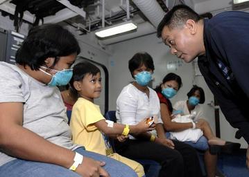 | Keywords: Pacific Partnership 2007 DVIDS53112.jpg en Petty Officer 2nd Class Astor Mojica attached to the amphibious assault ship USS Peleliu LHA 5 speaks with a Filipino child in the medical ward prior to surgery June 30 Mojica volunteers in medical as a translator to assist in putting the patients at ease The child was flown to the ship in support of Pacific Partnership 2007 The Pacific Partnership medical team provides general and ophthalmology surgery basic medical evaluation and treatment preventive medicine treatment dental screenings and treatment optometry screenings eyewear distribution public health training and veterinary services as requested by the government of the Philippines 2007-08-09 Petty Officer 1st Class Bryan Ilyankoff https //www dvidshub net/image/53112 070630-N-+++++-044 2007-08-09 13 52 USS PELELIU AT SEA PD-USGov-Military-Navy USS Peleliu LHA-5 Pacific Partnership 2007 USS Peleliu LHA-5 Images from DoD uploaded by Fæ |