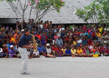 | Keywords: Pacific Partnership 2010 DVIDS316300.jpg en U S Pacific Fleet Band member Petty Officer 3rd Class Jason Gay embarked aboard the Royal Australian Navy landing ship heavy HMAS Tobruk plays the saxophone during a concert at the local market A contingent of 64 Sailors and non-governmental organization members assigned to the Military Sealift Command hospital ship USNS Mercy are embarked aboard Tobruk conducting the final leg of Pacific Partnership 2010 Pacific Partnership is the fifth in a series of annual U S Pacific Fleet humanitarian and civic assistance endeavors aimed to strengthen regional partnerships 2010-09-04 Petty Officer 2nd Class Eddie Harrison https //www dvidshub net/image/316300 100904-N-+++++-400 2010-09-07 18 11 KOKOPO PG PD-USGov-Military-Navy USNS Mercy T-AH-19 Pacific Partnership 2010 Pacific Fleet Band Images from DoD uploaded by Fæ |