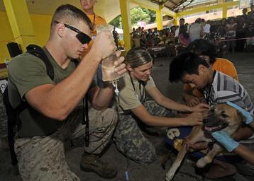 | Keywords: Pacific Partnership 2012 120624-N-BM466-086.jpg en Lance Cpl Travis Hurley left and U S Army Capt Shannon McLean administer an intravenous drip to a dehydrated dog during a veterinary civic action project VETCAP as part of Pacific Partnership 2012 The VETCAPs provide the host nations with veterinary aid treatment and education Now in its seventh year Pacific Partnership is the largest annual humanitarian and civic action HCA mission in the Asia Pacific region and is designed to strengthen regional partnerships and enhance a collective ability to respond to natural disasters and crisis U S Navy photo by Mass Communication Specialist 2nd Class Kristopher Regan 2012-06-24 Seaman Kris Regan https //www dvidshub net/image/1672425 120624-N-BM466-086 2014-11-22 20 24 MALAGA PH PD-USGov-Military-Navy Pacific Partnership 2012 Images from DoD uploaded by Fæ |