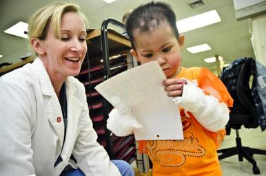 | Keywords: Pacific Partnership 2012 in Vietnam 120713-N-ZZ999-046.jpg en U S Navy Cmdr Valerie Tokarz watches as a three-year-old Vietnamese burn victim looks at a page of stickers aboard the hospital ship USNS Mercy July 13 2012 in Vinh Vietnam during Pacific Partnership 2012 Tokarz performed scar reduction surgery on the girl to improve the child's appearance mobility and the dexterity of her limbs Pacific Partnership is an annual deployment of forces designed to strengthen maritime and humanitarian partnerships during disaster relief operations while providing humanitarian medical dental and engineering assistance to nations of the Pacific <br>Unit Defense Imagery Management Operations Center 2012-07-13 T-AH 19 https //www dvidshub net/image/626974/pacific-partnership-2012-vietnam 120713-N-ZZ999-046 2012-07-18 04 12 VINH CITY VN PD-USGov-Military-Navy USNS Mercy T-AH-19 Pacific Partnership 2012 Images from DoD uploaded by Fæ |