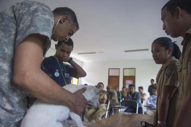| Keywords: Pacific Partnership 2014 140602-N-IL267-109.jpg en U S Army Maj Raghavan Sampathkumaran a veterinarian from Lompoc Calif assigned to the 109th Medical Detachment Veterinary Services takes a dog's heart rate for a pre-surgery physical examination as part of a veterinarian subject matter expert exchange at Dinas Peternakan Rote Ndao veterinarian clinic in Ba'a Indonesia during Pacific Partnership 2014 Pacific Partnership is in its ninth iteration and is the largest annual multilateral humanitarian assistance and disaster relief preparedness mission conducted in the Asia-Pacific region U S Navy photo by Mass Communication Specialist 1st Class Dustin Q Diaz/Released 2014-06-02 Petty Officer 1st Class Dustin Diaz https //www dvidshub net/image/1376595 140602-N-IL267-109 2014-06-03 06 00 BA'A ID PD-USGov-Military-Navy Pacific Partnership 2014 Images from DoD uploaded by Fæ |
