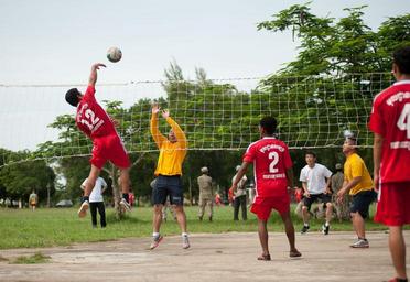 | Keywords: Pacific Partnership 2014 140624-N-CF750-251.jpg en A Cambodian sailor spikes a ball against Japanese and U S Service members during a Pacific Partnership 2014 sports day event in Sihanoukville Cambodia June 24 2014 Pacific Partnership is an annual deployment of forces designed to strengthen maritime and humanitarian partnerships during disaster relief operations while providing humanitarian medical dental and engineering assistance to nations of the Pacific U S Navy photo by Chief Mass Communication Specialist Greg Badger/Released Unit Defense Imagery Management Operations Center DVIDS Tags Foreign military; DIMOC; USAF; DVIDS Bulk Import 2014-06-24 Gregory Badger https //www dvidshub net/image/1418016/pacific-partnership-2014 140624-N-CF750-251 2014-06-26 00 05 SIHANOUKVILLE KH PD-USGov-Military-Navy Pacific Partnership 2014 Images from DoD uploaded by Fæ |